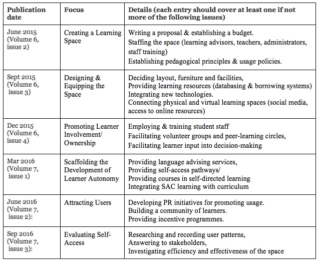 The column editor invites submissions of abstracts for the following aspects of self-access. Each abstract should be a maximum of 300 words, with the resulting paper being a maximum of 2500 words. The papers should be practical accounts detailing how that issue has been addressed in one particular context, including challenges encountered and the ways in which these have been addressed. Works in progress are welcome (indeed all self-access centres can be seen to be works in progress that will adapt to changing contexts).