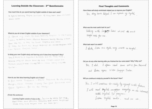 The comparative results of the two surveys, given to learners at the start of project and after the completion of the self-access portfolios at the end of the 16-week project, provides insight into both learner perceptions and behaviour with regard to learning beyond the classroom. The extracts presented here are unaltered with errors left intact to preserve the richness of the learner responses.