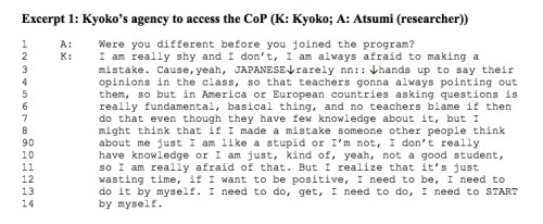 The interviews were audio-recorded, and then I listened to the data carefully multiple times to identify recurring themes. Strong recurring themes surfaced; namely, (1) Kyoko’s aspiration to become like a “native” (meaning native speaker of English) and (2) her transformation into a “positive” self in English. Although the following excerpts do not contain reference to “a native”, it recurrently appeared elsewhere in the interview. The first excerpt was selected to illustrate Kyoko’s agency towards cultural norms of English-speaking countries, such as voicing opinions. In this excerpt, she talks about herself before and after she joined the Model United Nation program, noting a change. By contrasting norms of Japan and English-speaking countries, Kyoko shows her positive evaluation of the English-speaking side of herself.