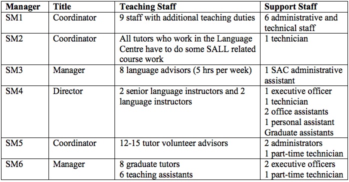 Although the six participants were clearly identifiable to us as ‘managers’, they were not all identified with this title within their institutions (see Table 3). The self-access centres which these managers were responsible for were often housed within larger academic units (usually Language Centres) and all the managers had additional roles to play within their centres such as, teaching, course-development, and administration.
