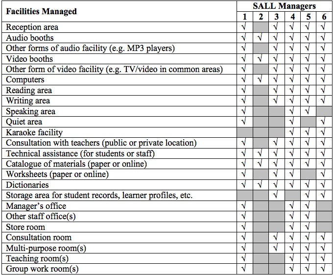 The SALL managers were also responsible for facilities management. We have tabulated, for easy comparison, the facilities managed by the SALL managers at the time of interview (Table 4). These data are based on the use of a checklist during the interviews (Appendix 1), further clarification sought where needed, and an invitation to managers to make additions to the checklist if required (no additions were made). It should be noted that SALL provisions change frequently, as student demand and/or resourcing change, and therefore what is presented here can only be seen as a snapshot taken at the time of data collection. It is clear from the table that a wide range of facilities were being managed by all but one of the managers.