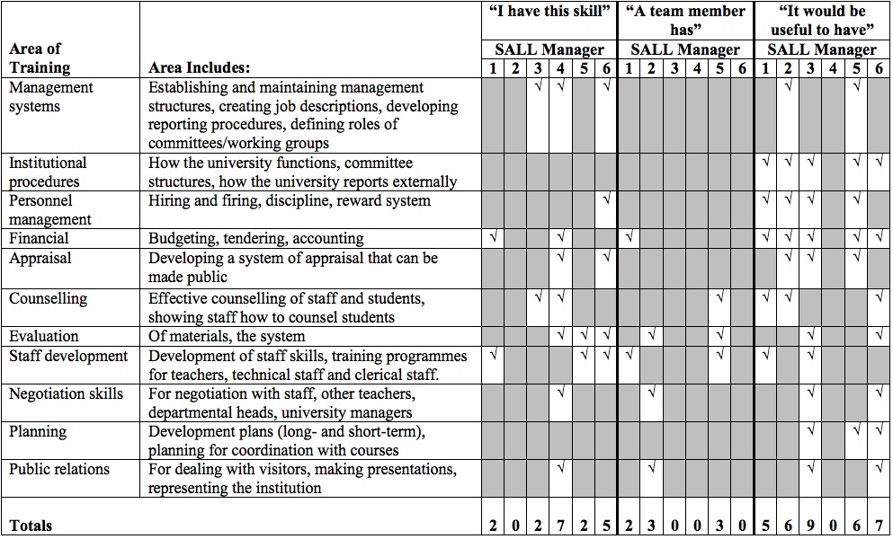 Examination of the business and educational management literature shows the importance given to management and the emphasis placed on management training. Surprisingly, however, there seem to be no specific training opportunities available for SALL managers, nor is there much attention paid in the literature to the need for it. Gardner and Miller (1999) suggest the following ten areas in which SALL managers could benefit from training: managing systems, institutional procedures, financial, appraisal, counselling, evaluation, staff development, negotiation skills, planning, and public relations. While it is clear from the literature (summarised in Table 2 below) that these areas are important for the effective performance of the role of the SALL manager; nevertheless, they remain largely unaddressed. It is for this reason that these areas of potential management training were investigated in the study reported here. The collecting of data directly from SALL managers makes it possible to ascertain the degree to which there is a gap in their training needs.