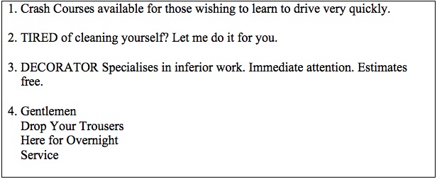 A sample of amusing and authentic bloopers are collected from the web or from books and presented to the learners who then have to spot the errors and work out what should have been written. Here are a few examples (see Table 2) taken from advertisements and published in (Hill, 2011):