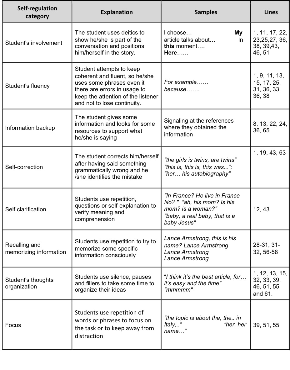 The data presented in this article are framed in reference to self-regulation. That is to say, the discursive linguistic elements are important not just in the process of language learning, but also in the way they mediate learners’ interactions so self-regulation can take place. Furthermore, the findings of the discourse analysis also show evidence of regulation of the self through the learner’s performance in the activity. Regulation is present in the engagement, the focus, and the organization of knowledge while the learners are doing the tasks (see Table 1).