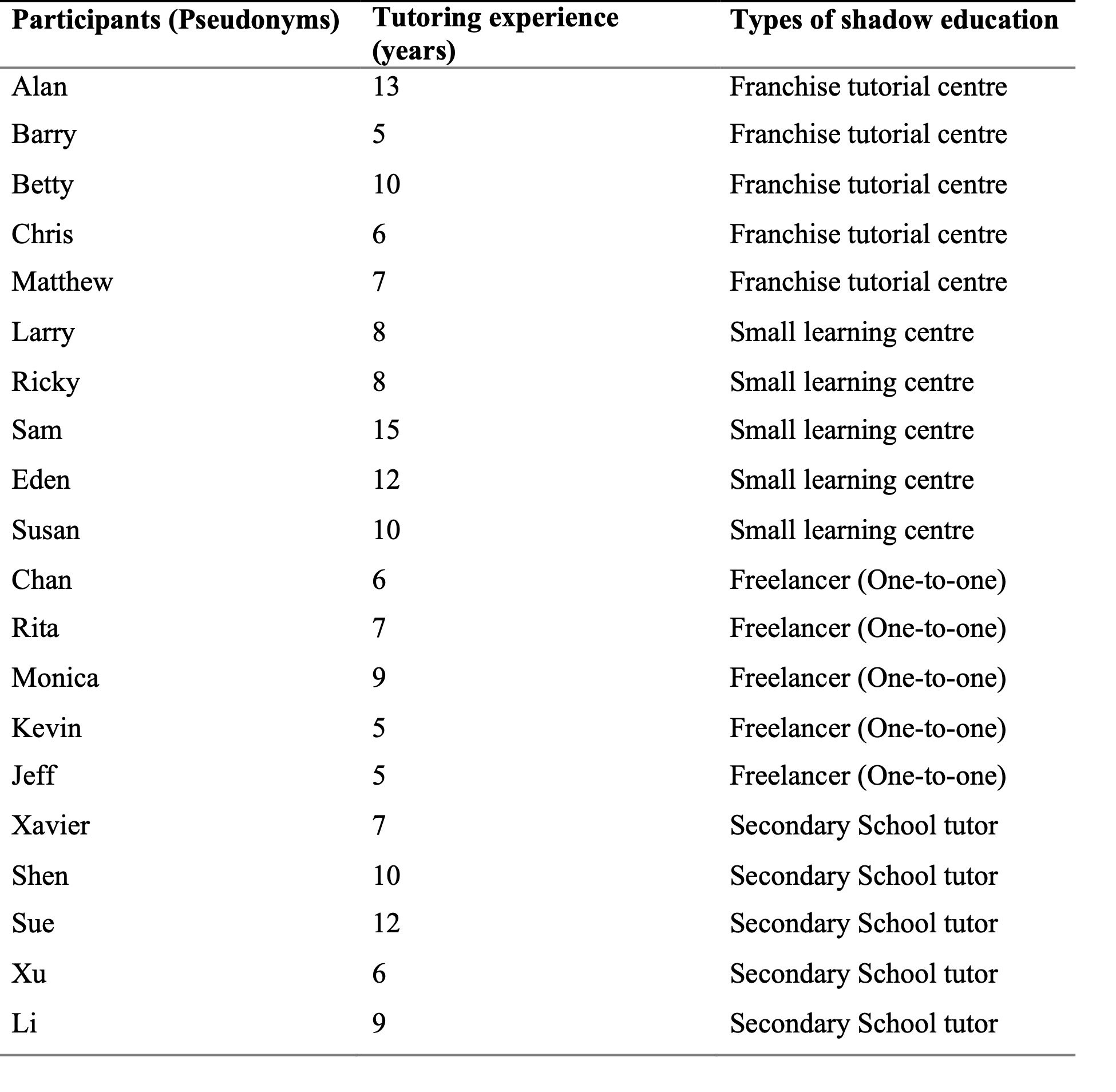20 local private tutors participated in this research, and at the time of the study, they were working at local private tutoring centres in Hong Kong. There are several types of shadow education in Hong Kong, and in this study, participants came from different kinds of private tutorial centres. Table 1 shows the participants’ demographic information.