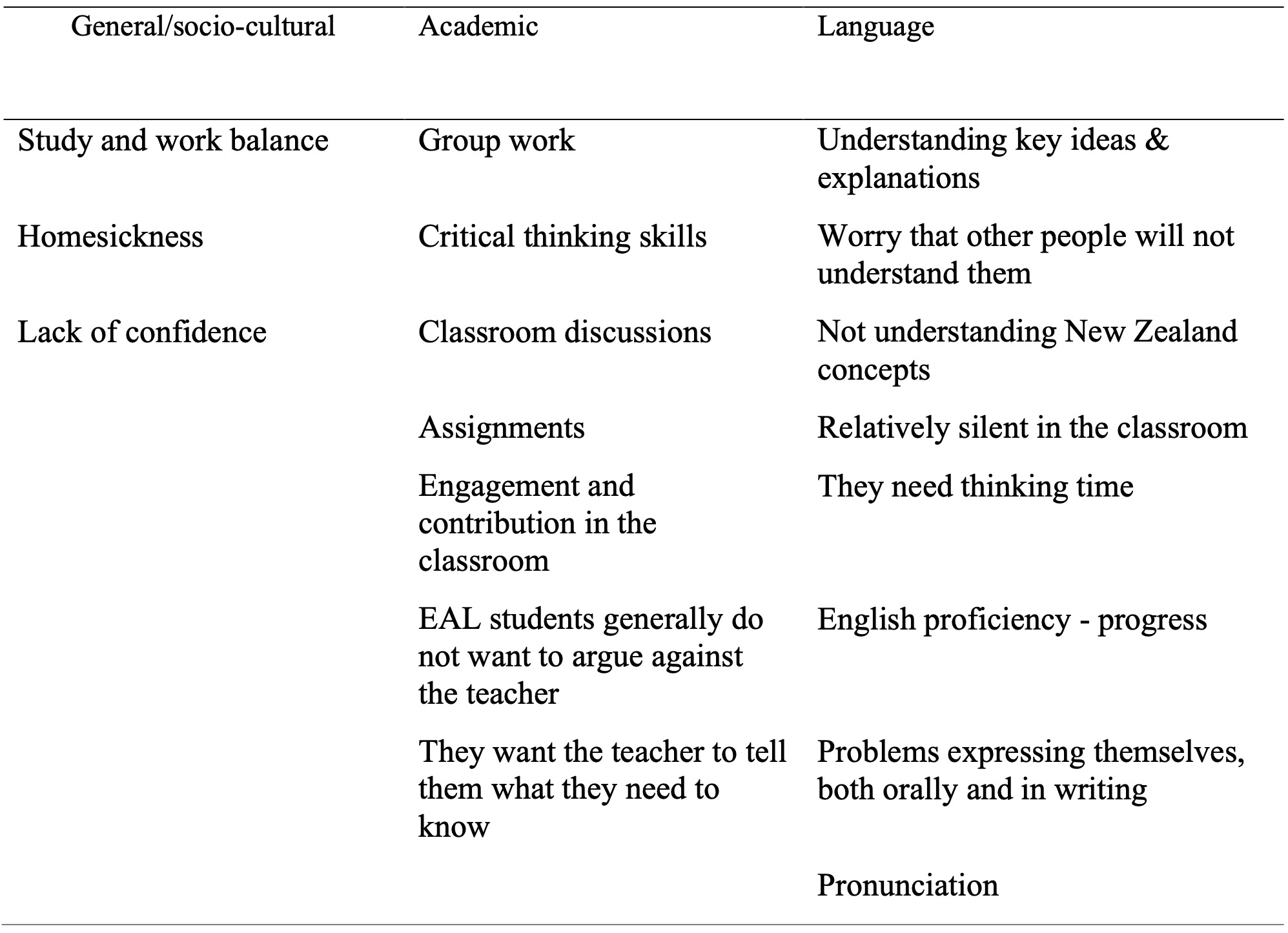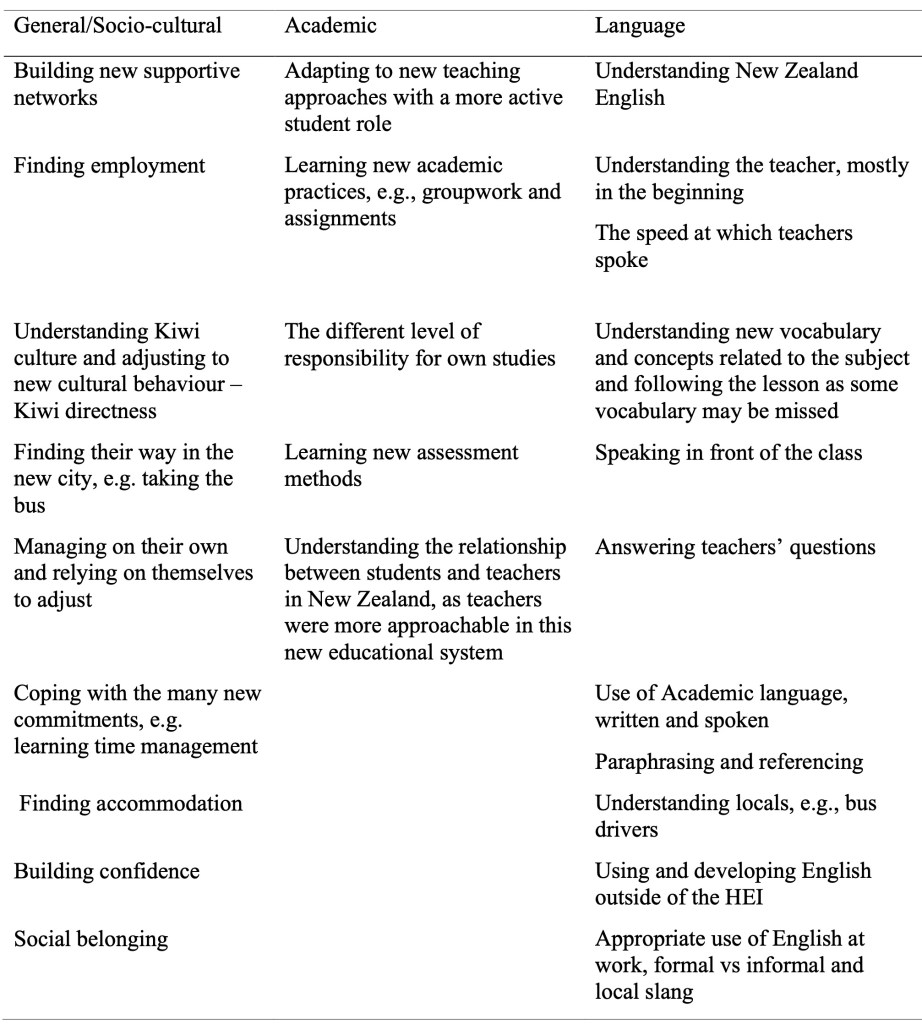 One of the challenges in the EAL student adjustment process concerned understanding the teaching and learning requirements in the new academic environment. Other challenges were language-related, especially in the first months, even though these students had passed the English language requirement and many of them had a high level of English from the start. Some also experienced challenges in establishing themselves in society, finding jobs, and making Kiwi friends. These challenges are outlined in Table 2 and will be elaborated on in more detail below.