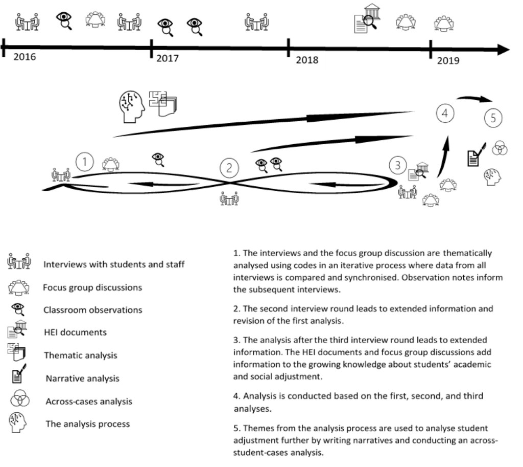 Table 1 shows that a range of documents were analysed: institutional documents, documents produced by the Government, as well as those produced by students for students. These institutional documents were analysed using the “three concurrent flows of activities” (p. 10) as suggested by Miles & Huberman (1994), i.e., data reduction – the process of selecting suitable documents; data display – an organised compressed assembly of information, permitting conclusion drawing; and the last activity was drawing conclusions and verifying findings. Other data were analysed using a thematic iterative process as described by Miles and Hubermann (1994), across-student cases using a model by Stake (2006), and narrative analysis, inspired by Polkinghorne (2006). (See figure 1 for more details)
