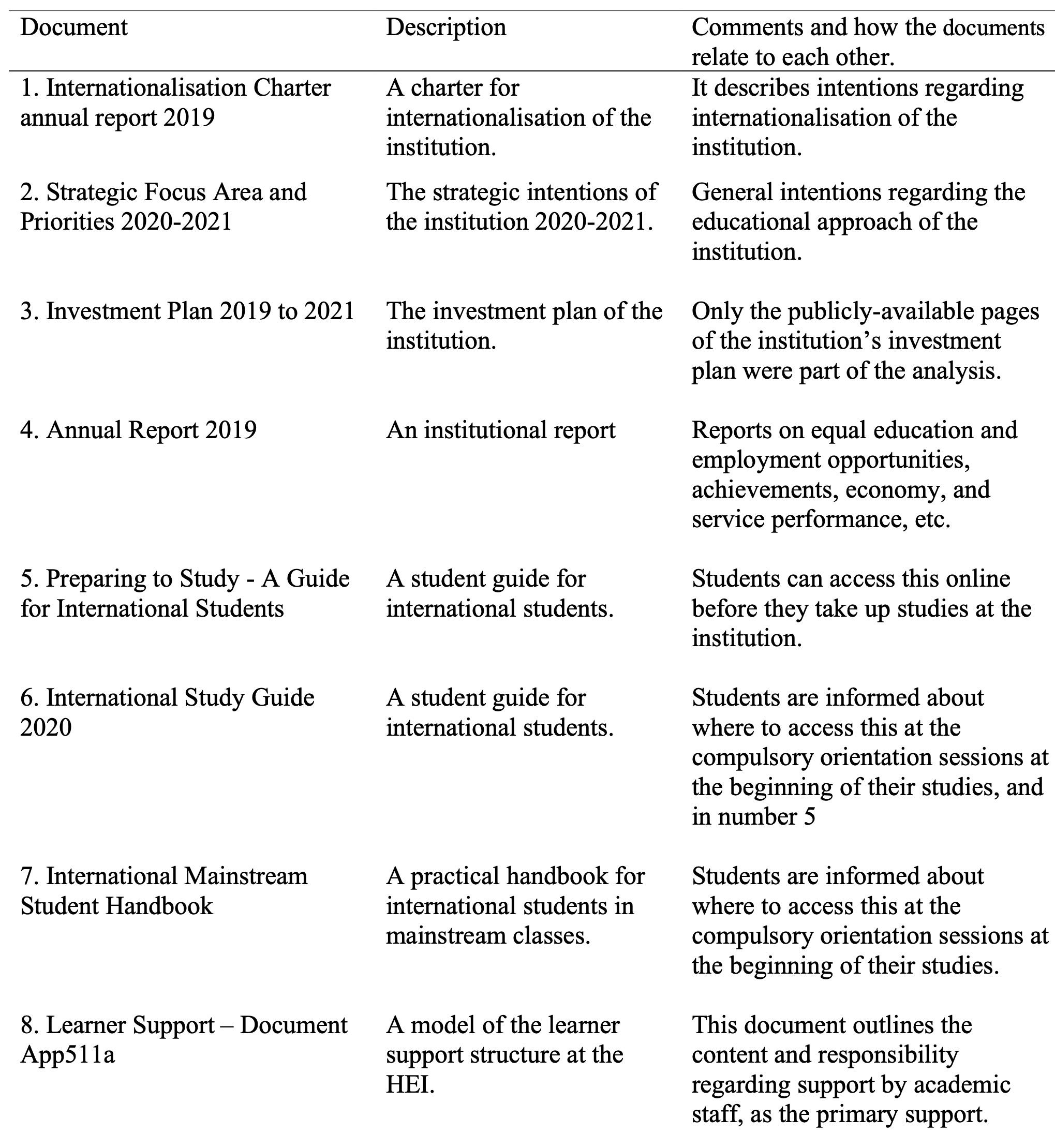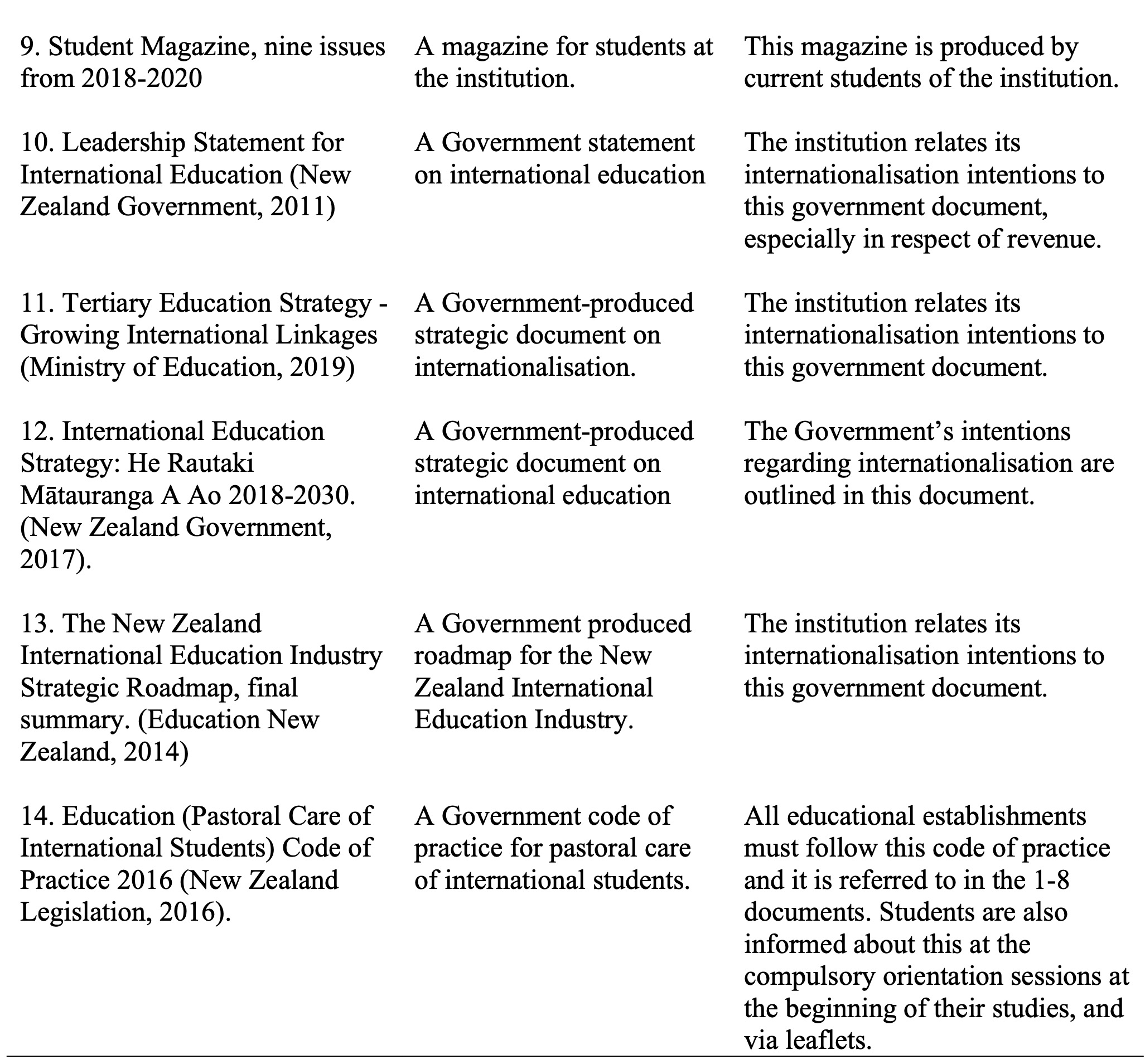 The study took an ethnographic approach, and it also included a case study. Data were gathered between 2016 and 2019 and involved the following: interviews on three occasions, with nine students from a range of countries (four students from India and one student from China, Malaysia, Taiwan, Germany, and New Caledonia), five teachers in the Business School, and two learning advisors; focus group discussions, with three groups with a total of seventeen students. (These were not the interviewed students but also from a range of countries); three classroom observations in the Business School; and a study of official institutional documents. See Table 1 for a description of the documents.