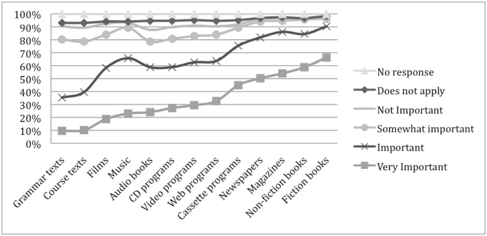 The information resources identified the most often by the most users as either very important or important were general language grammar books (90.4%), followed closely by movies on video/DVD (86.1%) and specific course textbooks (84.5%). Music was a close fourth chosen by 81.8% of respondents, and audio books were next at 75.4%. Of the information resources in the CAADI, language programs on all media were rated important or very important on average 60% with fiction books receiving the lowest rating of very important or important at 40%. (Figure 2)
