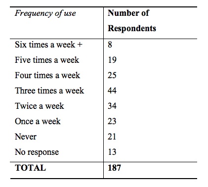 Surveys were distributed in person to every patron who entered the CAADI during a one-week period. Participants were asked to complete one survey only. Of the 196 people approached, 193 surveys were distributed and 187 were returned. Not every student answered every question on the survey. Where this occurred the response has been listed in the tables and charts below as “No response”.