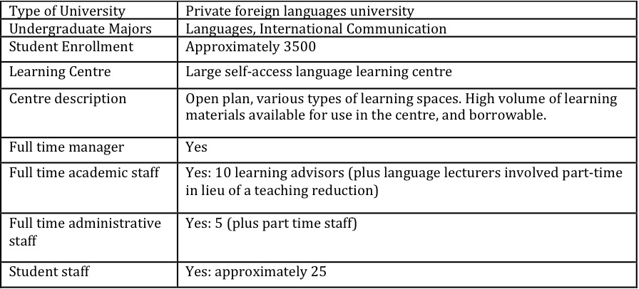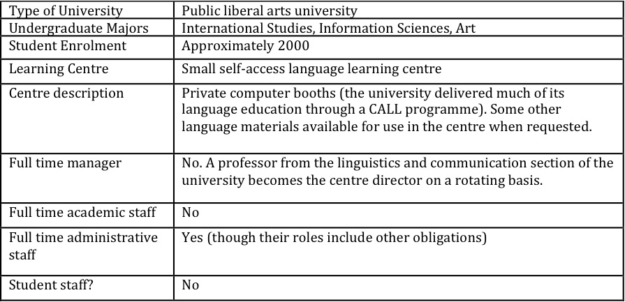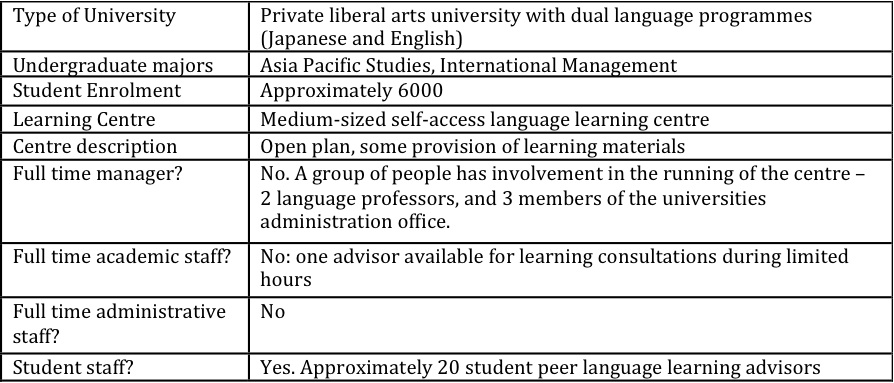 Three different staffing arrangements are described above. Each centre provides valuable services to students, but the depth and breadth of services offered differ greatly – a direct result of the number of educational staff available, their understanding of self-access language learning, and whether or not this role is their main priority.