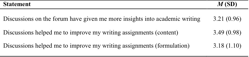 As part of the post-questionnaire, students evaluated various statements about their perceived gain in academic writing through their participation on the Facebook forum, as illustrated in Table 1.