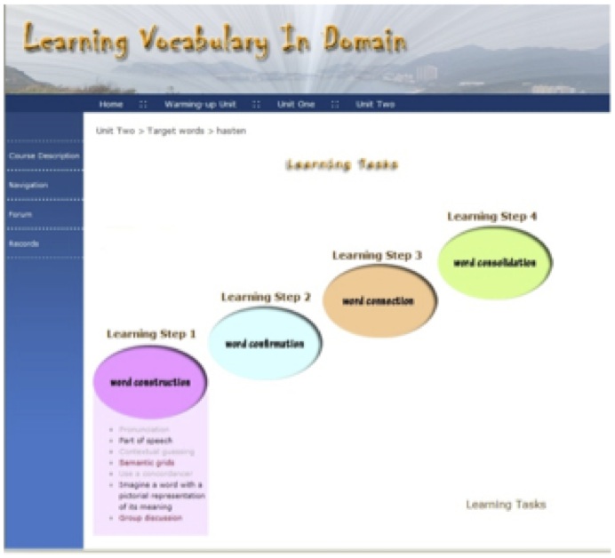 A vocabulary learning system called Learning Vocabulary In Domain (Figures 1 & 2) was developed to help students discover and construct new word knowledge in an authentic environment based upon their existing mental lexicon, while working either individually or in collaboration with others, in order to achieve successful self-directed vocabulary learning. The target words in the system were categorized into three units, belonging to the domains of “Dwelling”, “Happy-Sad” and “Walk” respectively (Trump, Trechter, & Holisky, 1992). Diversified and meaningful computer-based learning tasks (Table 1) based on those words were arranged systematically according to newly-designed vocabulary learning processes (Wu, 2012), which are expected to stimulate various processing-involved and interactive vocabulary learning strategies for the improvement of self-directed vocabulary learning. Regarding the printed material, it offered almost the same tasks along the same vocabulary learning processes.