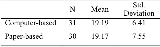 In order to ensure the validity of the research, the English scores of the two groups in the examination immediately after college entrance were compared by an Independent samples t-test. The results in Table 2 reveal that the mean score was 69.61 (SD = 12.32) for the computer-based group and 67.90 (SD = 10.59) for the paper-based group. These group means were tested using an Independent samples t-test, and this difference was found to be non-significant, t (59) = -.581, p = .563. It implies that the two groups demonstrate a similar language proficiency level before the start of the experiment. In addition, students’ performances in the pre-test that checked their initial knowledge of the target words in the intended materials were also compared between the two groups by using the Independent samples t-test. It turned out that, as shown in Table 3, the mean score was 19.19 (SD = 6.41) for the computer-based group and 19.17 (SD = 7.55) for the paper-based group. Using the Independent samples t-test, there was no detectable difference, t (59) = -.015, p =.988. Meanwhile, the students in both groups were found to be unfamiliar with the target words. The comparisons above indicate that the two groups were qualified to participate in the experiment.