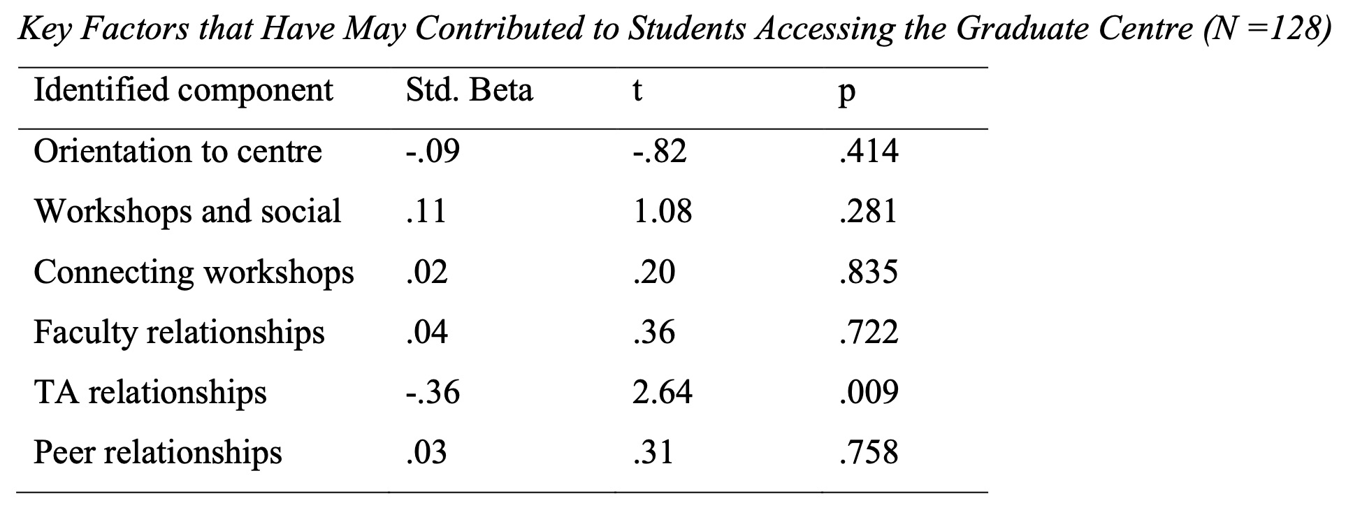 As Table 2 illustrates, the only factor that predicted if students would access the centre was their relationship with a teaching assistant. Significantly more international students accessed the centre than did domestic students. A statistically significant relationship was observed between domestic and international students in accessing the graduate centre (x2 = 26.67; p = < 0.001; df = 1).