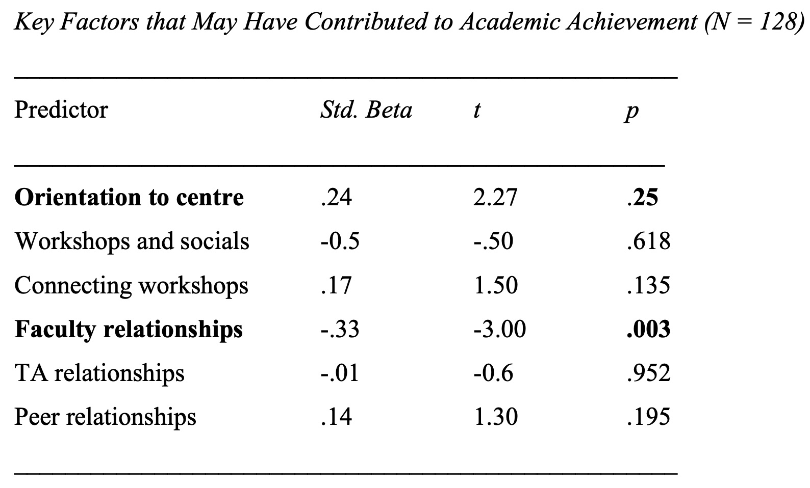 As Table 3 shows, faculty relationships with students and orientation to the graduate centre were the only key items that predicted academic achievement.