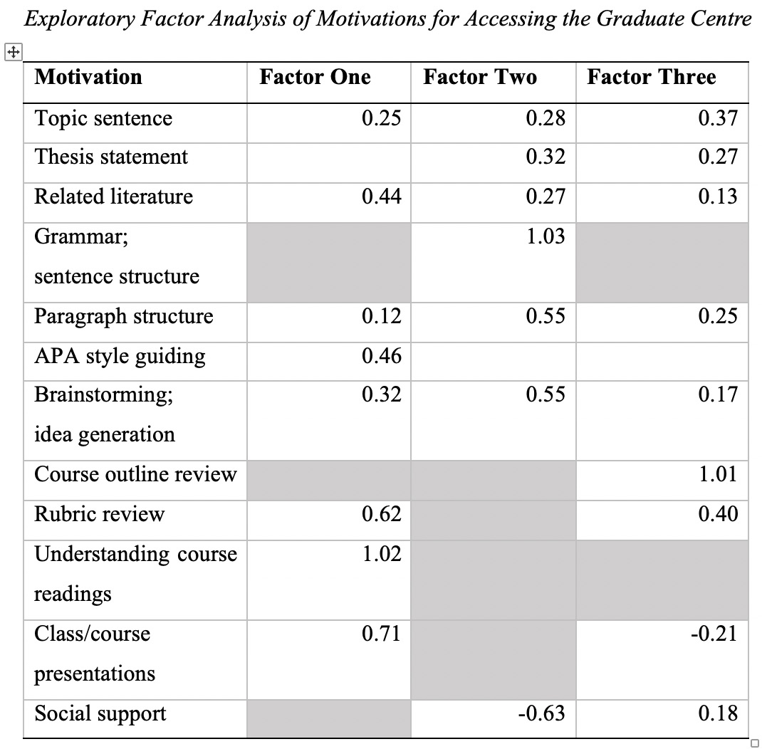 An exploratory factor analysis (EFA) of the survey results was completed. Because the survey asked students how often they accessed the centre, an analysis could be done to identify which key factors would predict student access. Fixed regression was used with the key items serving as predictors and graduate centre access as the outcome. To better understand the relationship between the motivations, tetrachoric correlations between the various motivations were conducted. Students were asked for their average grade in the program, which allowed a regression analysis to identify which key factors would predict academic achievement. Separate analyses were conducted for gender and country. For gender, separate analysis of variances (ANOVAs) were conducted for each key factor. Separate one-way ANOVAs were conducted on each of the six key factors to examine differences among different countries.