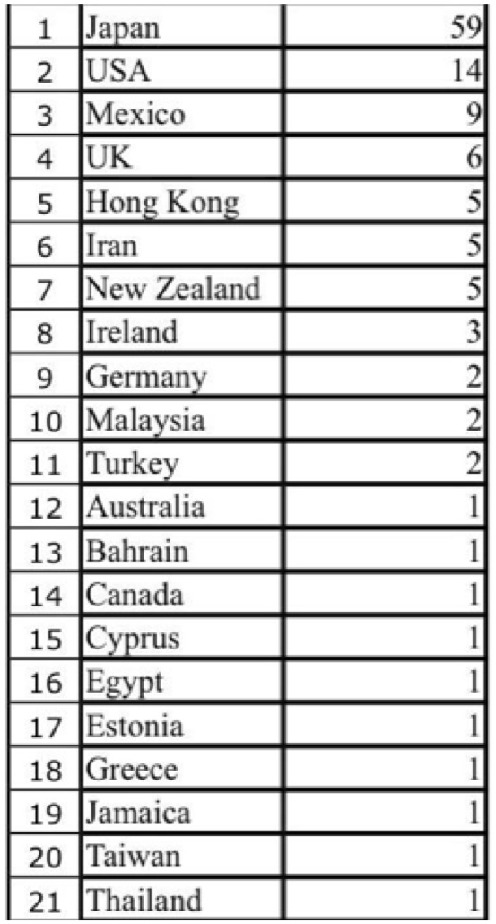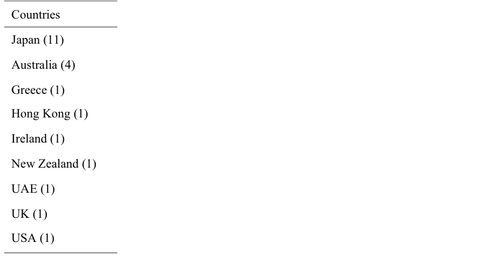 Research Question 3 was concerned with how diverse the reviewers and editorial team members of the journals were. The statistics showed a high number of members based in Japan (Table 2). We also noticed that there were more than twice as many males as females on the editorial and review boards (Table 3). In terms of the reviewers, they were based in 24 different locations which seems reasonably diverse. However, the majority (29 out of 73, which is 40%) were based in Japan (see Table 4).