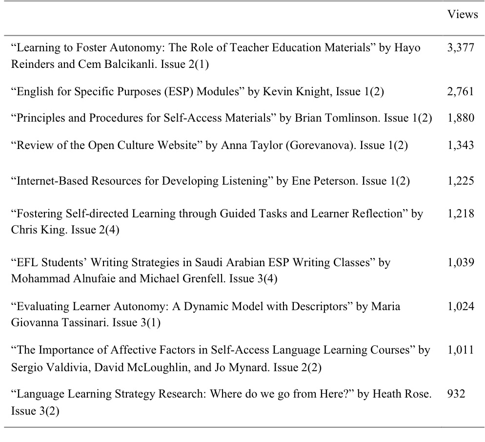 In order to highlight the amount of access that individual contributions might get, a summary of the articles that received the most views in a one-year period and the number of views is shown in Table 6. The least frequently accessed articles are the editorials, some receiving just one or two views – or no views at all.