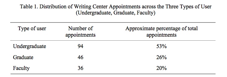 Table 1 shows that of the total number of appointments, 94 were attended by undergraduate students, 46 by graduate students, and 36 by faculty. Though it would appear that undergraduates are making the most use of writing center services, it is worth pointing out that graduate students and faculty often collaborate on research projects. For this reason it may be more illuminating to consider these two groups together. Thus, undergraduates make up roughly half of the appointments (53%) while graduate students and faculty make up the remainder (46%).