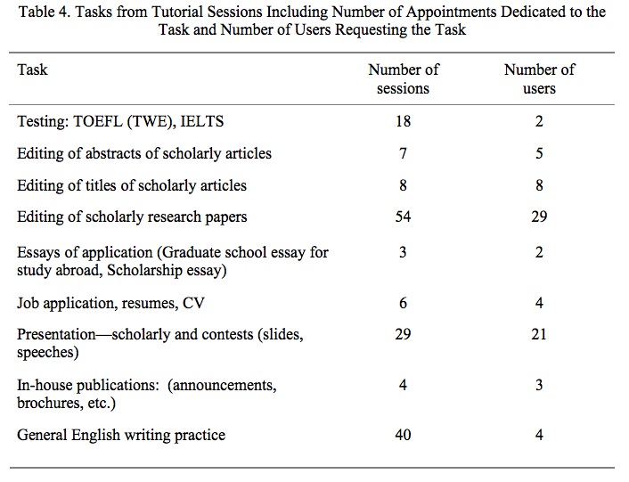 In addition to indicating the main focus of the session, writing tutors were also asked to record the specific task requested by the user. These are listed in Table 4, with a distinction made between the number of sessions dedicated to the task and the number of users requesting the task. This distinction was made because, while at first glance it may appear that “Testing” was of significant concern to writing center users, in fact it was of significant concern for only two users. Also, it should be noted that three tasks – “Editing of abstracts,” “Editing of titles,” and “Editing of scholarly research papers” – may be combined as these tasks were all in service of one goal: scholarly research paper publication. When combined, these items make up the bulk of tutorial tasks.