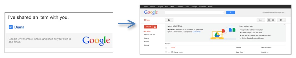 Figure 3. Center for ESL pre-college writers: Gmail invitation to share a Google Doc >> writer opens up their Google Drive