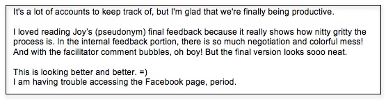 Note that Appendix 1 shows the finished feedback that this advisor refers to. While this reflection on how technology trials are going (using two Google App logins and a third Facebook login) is mixed, there is no question that the peer advisor is involved and positive about where she and her colleagues are going in evaluating technologies for their center. The post is open and has a spirit of collaborative experimentation.