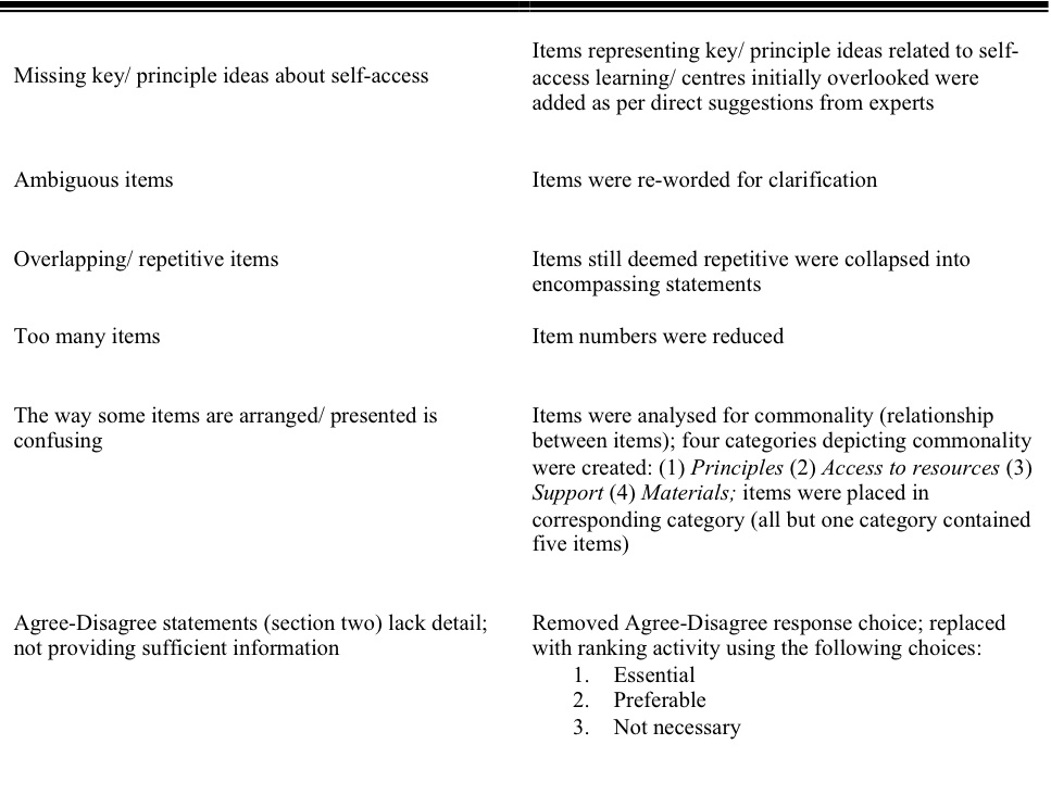 To construct the questionnaire, I began by examining the existing literature on self-access learning/ self-access centres. I evaluated statements and descriptions in the literature which defined and described what self-access learning was and what self-access centres do/ should do. I compiled a large list of items (over 50 statements) taken directly from the existing literature. I then looked for statements that overlapped (essentially saying the same thing) and collapsed them into single items. Finally, I took this comprehensive list of items and turned them into “SACs should…” statements, asking participants to select from Agree-Disagree responses. Once the initial draft of the questionnaire was created, I solicited feedback from colleagues in Japan and other self-access learning experts around the world. Eight individuals from five different SACs evaluated the initial items. Based on the feedback, I made revisions. Issues with the items and the corresponding revisions are described in the table below: