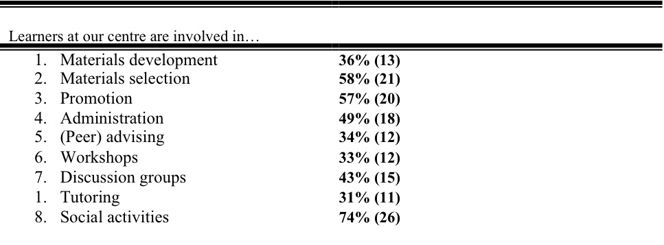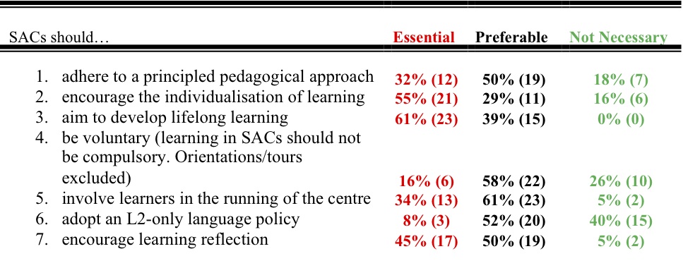 Item 5: SACs should involve learners in the running of the centre. This item is directly related to learners’ contributions to SACs. Only 34% of SAC experts said it is essential to involve learners. This is a surprising number again. Particularly since the field of language education has shifted toward more learner-centred pedagogy within language learning classrooms, even teachers’ and learners’ understanding of effective language learning practice now includes the practice of having learning activities ‘centred’ around the learner (Allwright, 1981). There may be various reasons to support these responses (without the interview data this remains highly speculative), but it is clear that from the participants sampled, SAC practice has not prioritised learner involvement. SACs still seem very much top-down institutions where teachers and educators control and direct how things are structured. This supports previous criticism which maintains that SACs continue to promote a system limiting user activity to the role of consumers of products selected and presented by others (Benson, as cited in Malcolm, 2004). Undoubtedly such a system, rather than fostering pro-active learner behaviour, perpetuates passivity from learners throughout the language learning process.