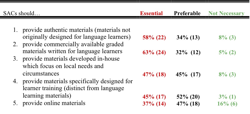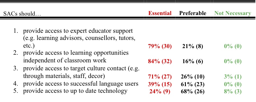 Item 1: SACs should adhere to a principled pedagogical approach. This item explored the idea of a supporting SAC practice with pedagogical principles. Only 32% of respondents said that a principled approach to language learning was essential. While much of the literature believes that SACs should aim to encourage and promote learner autonomy/ self-access learning (Benson & Voller, 1997; Gardner & Miller; 1999) this idea does not seem to be reflected in the responses. This might be due to the difficulties in defining autonomy or self-access learning (Gardner & Miller, 1999; Pemberton, Toogood, & Barfield, 2009), or it could be related to the lack of real theory in language education. It has been argued that there still exists no single theory of second language teaching (Woods, 1996) or of second language acquisition (Larsen-Freeman & Cameron, 2008). Nevertheless, having principles supporting the practices of SACs would offer both practitioners and learners some parameters with which to at least measure the effectiveness of what is taking place within the centre. This idea of a SAC’s pedagogical approach (and the principles that would assumedly underpin this approach) is an avenue worthy of further exploration. I intend to use phase two of this project to concentrate on this issue.