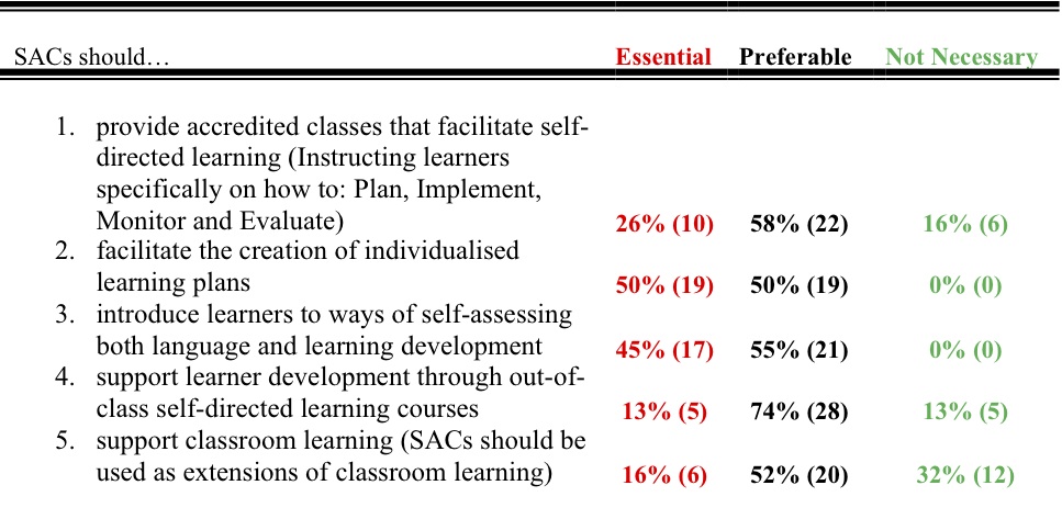 In this paper I present the results of phase one of a two-phase study. Phase one included gathering and analysing responses to an online questionnaire surveying beliefs about a variety of topics directly related to SAC practice. Responses to the questionnaire were useful in illuminating the range of beliefs held by different SAC experts and in suggesting that this variety in perception influences the diversity found within centres around the world. I will use the results of phase one to prepare for a more in-depth investigation into what SAC experts believe about SACs. Phase two will use semi-structured interviews (structured around the results from phase one) to create a richer and more accurate understanding of the interplay between SAC experts’ beliefs and their centres’ practice. Phase two of the study has yet to be completed. Therefore, any conclusion or implications at this stage are tentative at best. A follow-up paper will include a more detailed description of the findings. Results discussed in this paper should be viewed only as a preliminary glance at the variety of beliefs held by SAC experts. Nevertheless, I believe that this glance is a valuable first step in a project that looks to create a clearer picture of SAC practice and examine how different approaches to self-access learning can be successful in meeting learners’ needs.