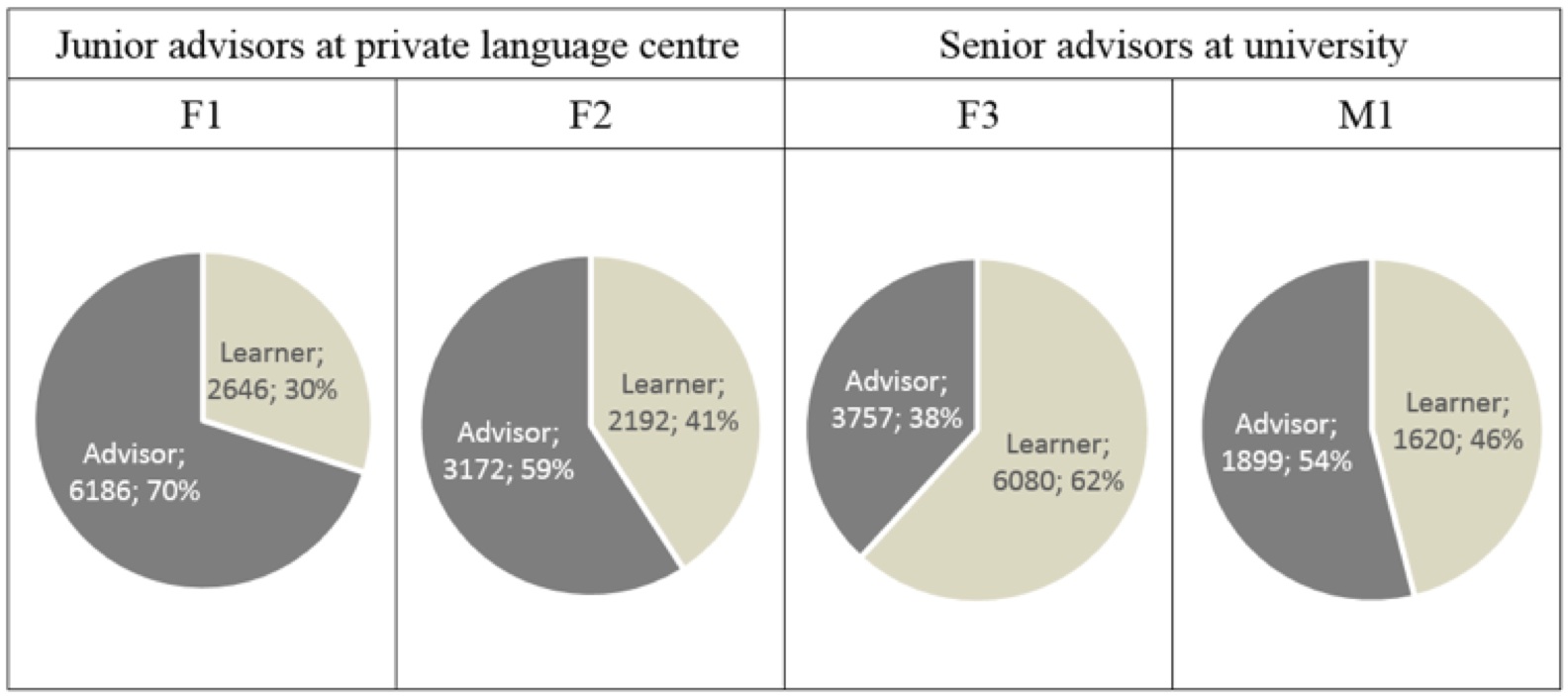 Figure 1. Distribution of Speech Measured by the Total Number of Words Pronounced and its Percentage for Each Speaker (advisors in dark grey, learners in light grey). [click to enlarge]