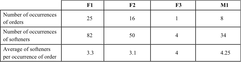 In the corpus (made of four advising sessions) the researchers found a total of 50 softened orders and only four non-softened orders; they also found a total of 15 disagreements, of which 13 are softened. So, in LLA’s discourse, orders and disagreements are present, but are generally expressed in a softened and non or less threatening way. Tables 3 and 4 below present the distribution of those speech acts for each advisor. F1 and F2 are the junior female advisors working at a private centre, and F3 and M1 are the female and male senior adviser working at the university.