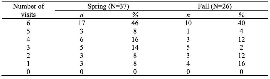 Out of 37 students, 17 students made the full six visits to the English lounge in the Spring semester. In the Fall semester, nine students opted for alternative homework, but 26 students continued their participation in the study, and ten of them made the full six visits (See Table 1). As will be discussed in the following sections, these students seemed to have gained joy and confidence in L2 interactions through the English lounge experience. As a consequence, one female student made a year-long study abroad to New York in her third year of university. Also, during the period of the study, two male students started going to the lounge with their own will almost every day outside their homework assignments. Notably, one of them went on a short homestay trip to Perth right after the study period.