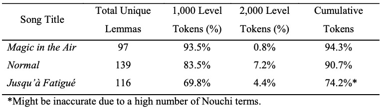 Magic in the Air has the fewest unique lemmas, there are many words that repeat, and it has the easiest vocabulary of the three songs. The 8,000-lemma level accounts for 98% coverage of the words in the song. However, if one word were omitted from the analysis, the 5,000-lemma level would provide 98% coverage. It also contains English, cognates, and a lot of proper nouns that were already familiar to me (French national [soccer] team nickname and players’ names). These factors made the song easier to understand.