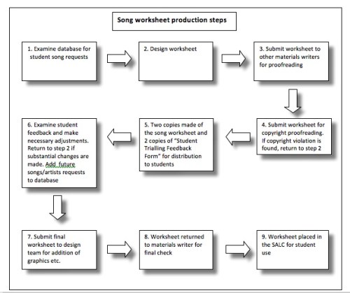 Before the song worksheets are ready for student use, the materials creators are asked to follow a number of steps to ensure that there are no copyright infringements and to check for ease of use, a process best illustrated with this diagram (figure 1):