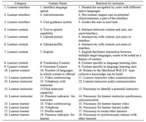 The feature group with the fewest number of possible features was the learner-learner interactivity grouping. Similar to the results of studies by Moore and Kearsley (1996) and Chou (2003), this is the main area where websites consistently failed to support learners with a wide range of options. Both babelnation and lingq contained only one feature in this group, where each provided only a bulletin board system for learners to have contact with each other.