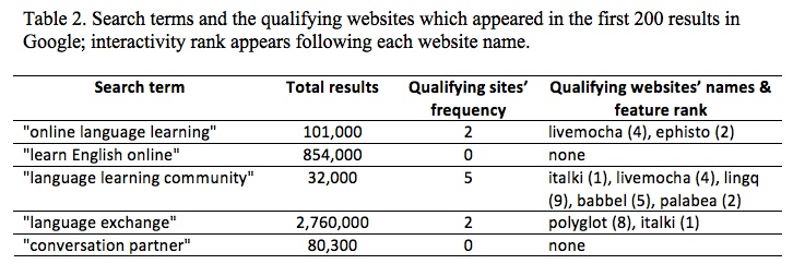 The interdisciplinary research group provided a number of search terms learners had used, or learners had said they had used. The terms were collected and discussed in the research group. The list was narrowed via consensus about which terms or phrases learners were likely to use on their own. Table 2 presents these phrases on the left with the number of total results to the right of each phrase. The two columns on the right in the table show the frequencies of qualifying websites appearing in Google search results for these search phrases. For each search, I scanned the first 200 results with one member of the research group. Thus, in the end, two researchers scanned the 1000 search results for the five search phrases. Quotes around the phrases were used to narrow results, and avoid unrelated websites. “Learn English online” was included because English was reasoned to be a lingua franca in Web 2.0 websites, even though it may not have been the target language for many of the learners. Four of the nine websites that appeared in the first 200 results ranked in the top 3 in terms of interactivity features. Italki, the number one ranking website, appeared twice, as did Starbuck’s Coffee’s web initiative, livemocha. Thus the learner who brings no discrimination (random clicking on search results) has a less than 1% chance of actually visiting a Web 2.0 site, and a 0.4% chance of selecting one of the top three Web 2.0 recommended sites.