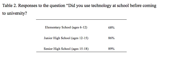 Bennett and Maton (2010, p. 329) write “it will continue to be important to measure access and activity through […] surveys [to provide] a more sophisticated, rational debate that can enable us to provide the education that young people deserve” and we “must consider data-driven evidence showing who these students are in total when developing ICT policy” (Nasah et al., 2010, p. 550). The research presented here will provide a snapshot of how 105 first year Japanese university students have interacted with technology in their pre-university lives with the aim of enabling educators, in particular SAC staff, to make decisions about purchasing, ICT developments and how best to use the information presented in this paper pedagogically.