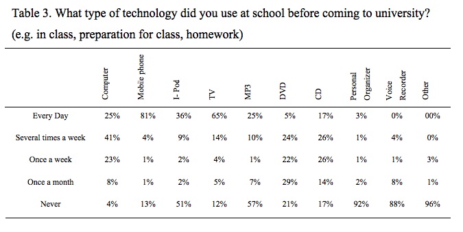 Table 1 shows that nearly all students have computers at home, use mobile phones and posses some kind of music storage/ listening device. These are all used at least several times a week by 96%, 96%, 89% and (combining figures for I-pod and MP3 players) 95% respectively. These devices are virtually universal. DVDs and CDs are used infrequently but at least once a month by the majority of students; 85%, 83% and 66% respectively. Televisions are still regularly used by most participants.