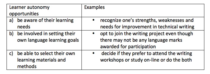 Little (1999) argues that in formal educational contexts, “the basis of learner autonomy is acceptance of responsibility for one’s own learning” (p.11). An autonomous learner takes responsibility for various aspects of learning (Benson & Voller, 1997; Holec, 1981). This study examines how learner autonomy opportunities were provided at various stages of writing in an on-line editing programme for a group of electronic engineering students and how the students took charge of their language learning when receiving feedback on their technical writing. The impact on their own learning effectiveness of the decisions students made is also discussed.