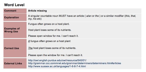A number code is pasted next to the language error identified and students can legitimately respond to these spotted errors in different ways. Students who are confident of their own ability to correct their problems edit the error immediately and move on to read the next feedback. Others who need more help can click on the number code to find more information about the problem. As the language problems were highlighted but not corrected, students should feel obliged to find out the correct answers for themselves.