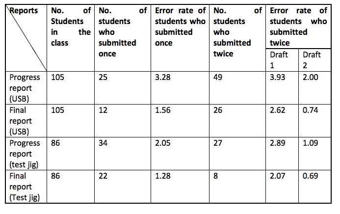 In semesters 3 and 4, the Electronic Engineering students were asked to write two reports, namely a Progress Report and a Final Report, for a product they had designed in each semester. Students were first asked to write a Progress Report to describe the problems encountered and changes made during the production process, and, at the end of the semester, a Final Report to discuss the underlying theories, the algorithms, the approach, and the significance of the production. Two products, namely a rechargeable USB and a test jig, were designed and four reports were sent in. Students were asked to write about 1,000 words for the Progress report and 1,200 words for the Final Report.