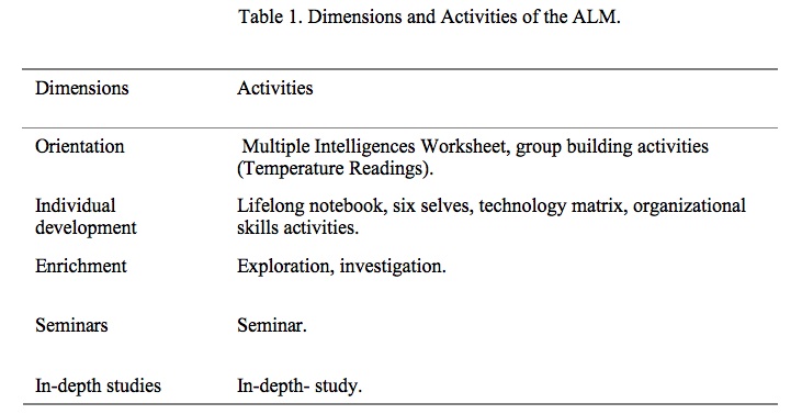 The major goal of the ALM is to facilitate the growth of students as independent, self-directed learners, with the development of skills, concepts, and positive attitudes within the cognitive, emotional, and social domains in order to initiate their learning and evaluate its outcome. In other words, the model aims at helping students become 21st century learners through the use of activities in the five major dimensions of the model. The five dimensions of the model are: orientation, individual development, enrichment, seminars, and in-depth study.