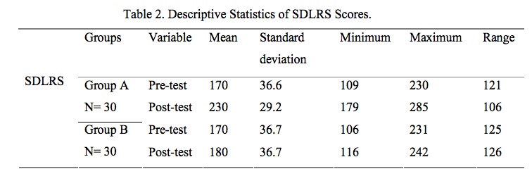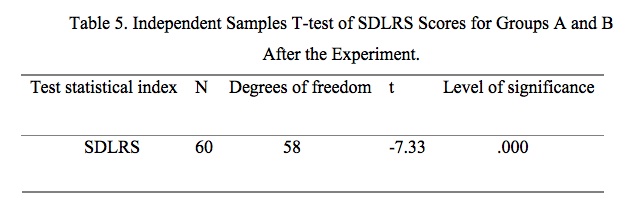 Table 5 represents the t-test results for examining the difference between both groups A and B’s post-test mean scores. The value of P is smaller than .05 which means that the difference between SDLRS mean scores of both groups is statistically significant. The mean score and the standard deviation of group A are 230 and 29.2 respectively. The mean score and the standard deviation of group B are 180 and 36.7, respectively.