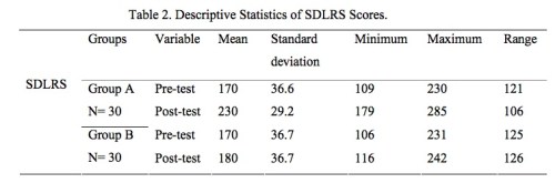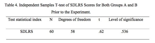 Table 4 indicates that the difference between SDLRS scores of both groups A and B is not statistically significant.