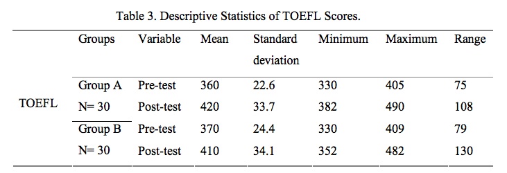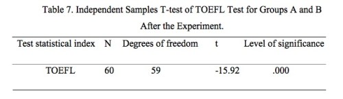 Table 7 represents the t-test results for examining the difference between both groups A and B’s post-test mean scores. P value is smaller than .05 which means that the difference between TOEFL mean scores of both groups is statistically significant. The mean score and the standard deviation of group A are 420 and 33.7 respectively. The mean score and the standard deviation of group B are 410 and 34.1 respectively. In other words, group A has a statistically significantly higher mean score on TOEFL than group B.