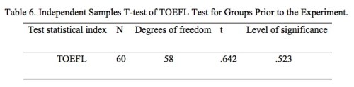 As table 6 indicates the difference between TOEFL scores of groups A and B is not statistically significant.