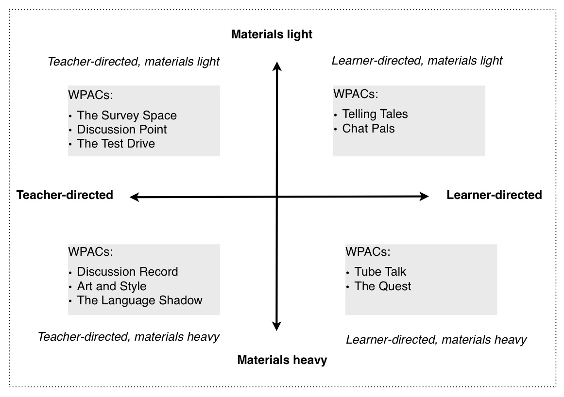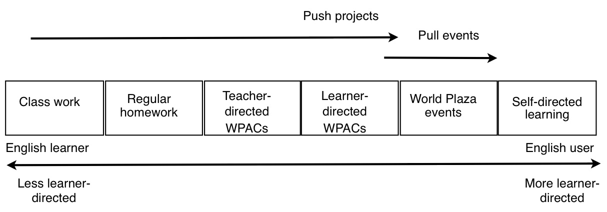 One way we thought about push activities was in terms of how teacher-directed or learner-directed they were. For example, when a WPAC was an interview, if the teacher decided the topic and all of the questions and the learners only chose their partners, then this WPAC was relatively teacher-directed. On the other hand, if the learners could decide the topic and write their own interview questions, then this WPAC was more learner-directed. The distinction is important because making WPACs more learner-directed over the semester and year led learners to take more control over their own learning and develop greater autonomy.