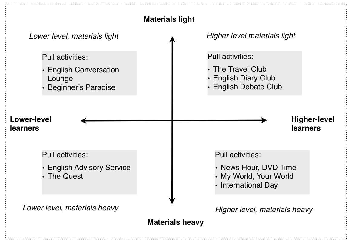We thought about pull events in a similar way to the push activities; in terms of how many materials they required. However, rather than thinking of pull events in terms of being teacher-directed or learner-directed, we conceptualized them in terms of which level of learner they were best suited for, i.e. lower-level learners or higher-level learners. Figure 3 illustrates this framework, and provides examples of each type of pull event, which are all explained in more detail in Appendix B.